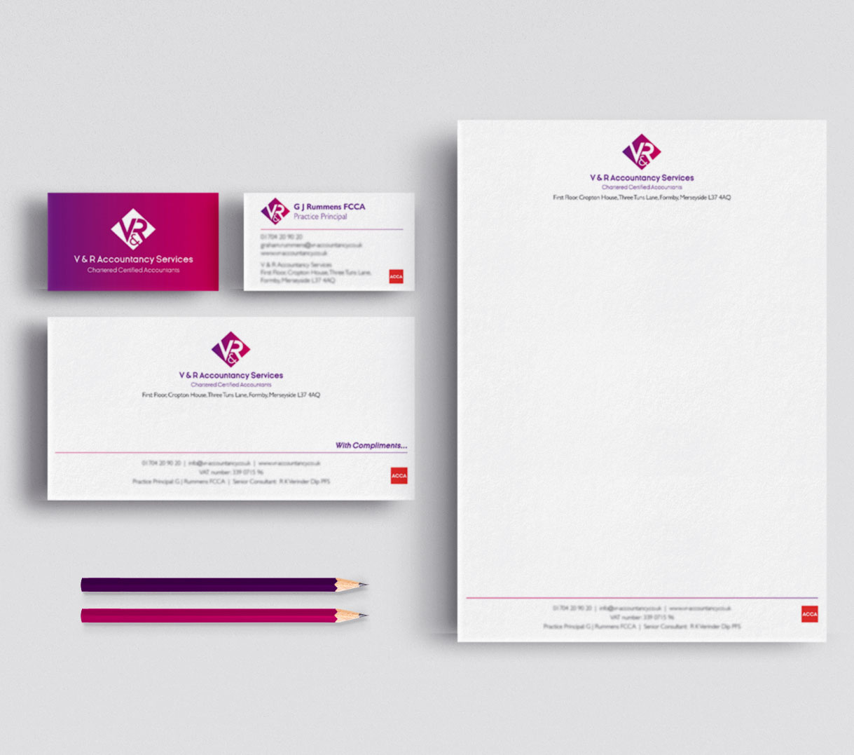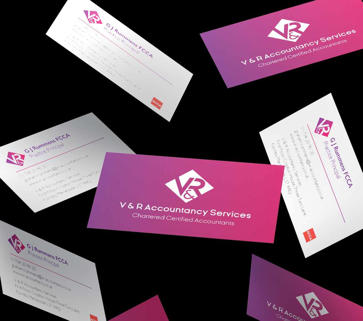 V & R Accountancy Services are a progressive firm of Chartered Certified Accountants based in Formby, Merseyside. The directors recently acquired another local practice and wanted a fresh modern brand identity to take the business in to the future.